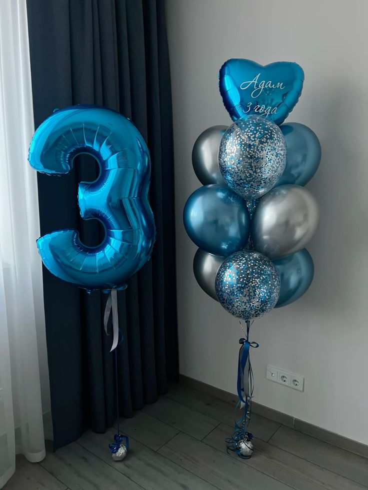 Helium Balloons Single Number Set Blue '3' with Foil Heart-Shaped with Sticker and Latex Chrome Blue and Silver Bunch with Ribbons - Perfect for any Occasions!