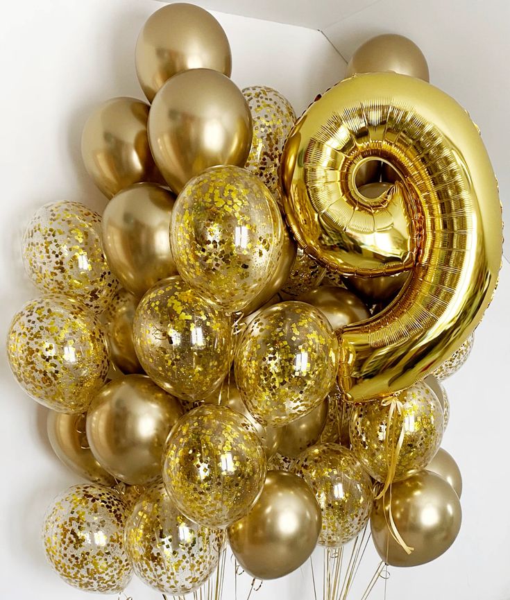 Helium Balloons Single Number Set Gold '9' and Latex Bunch Gold and Clear with Confetti - Perfect for any Occasions!