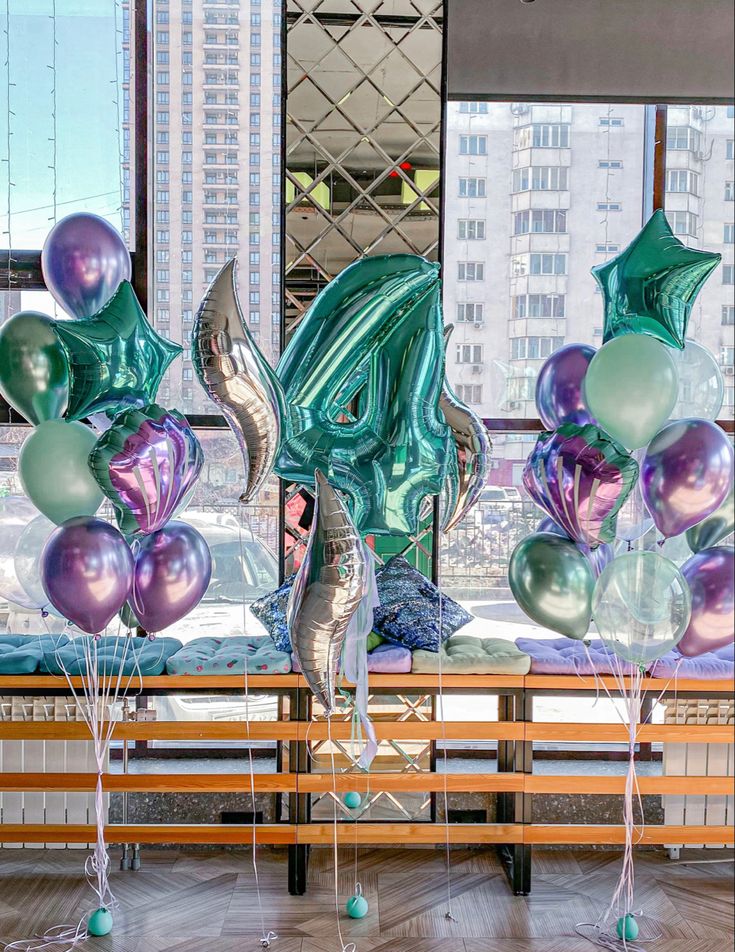 Helium Balloons Single Number Set Green '4' with Shell, Star-Shaped Latex Chrome Green, Green, Clear and Purple Bunch - Mermaid-Themed Under The Sea-Themed Perfect for any Occasions!