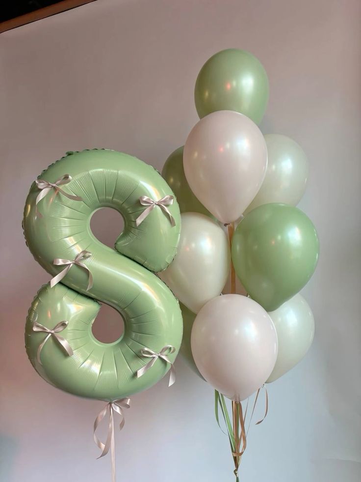 Helium Balloons Single Number Set Green '8' with Small Ribbons and Latex Bunch Different Shades of Green and White - Perfect for any Occasions!