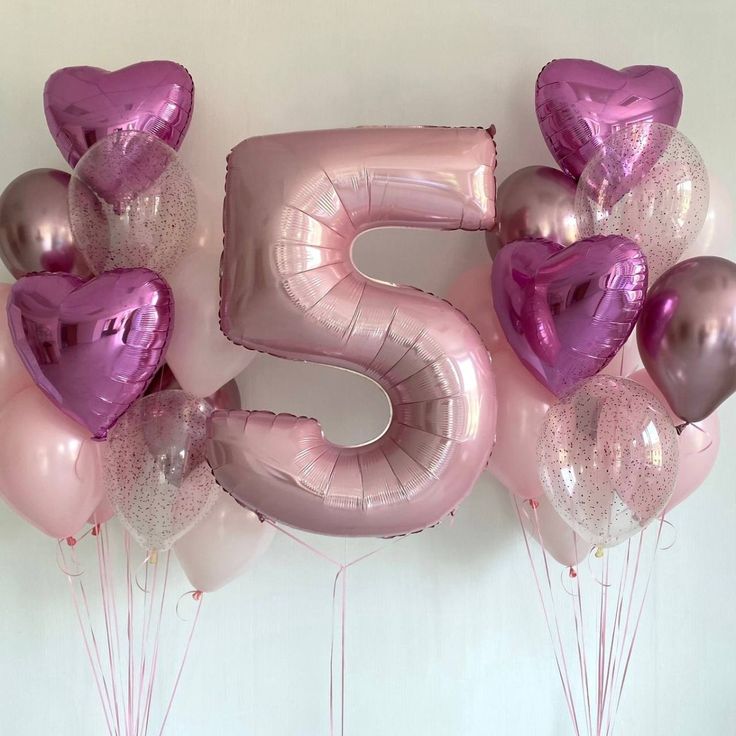 Helium Balloons Single Number Set Pink '5' with Latex Pink, Chrome Pink, Clear with Confetti and Heart-Shaped Foil Bunch with Ribbons - Perfect for any Occasions!