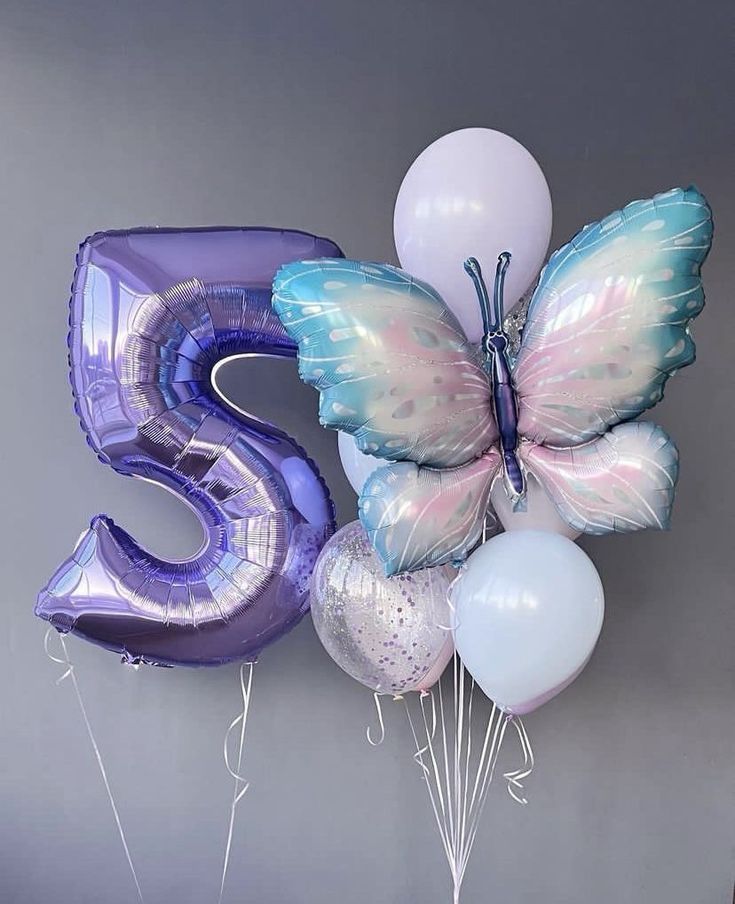 Helium Balloons Single Number Set Purple '5' and Latex Blue, Purple and Clear with Confetti, Butterfly Foil Bunch - Garden-Themed Perfect for any Occasions!