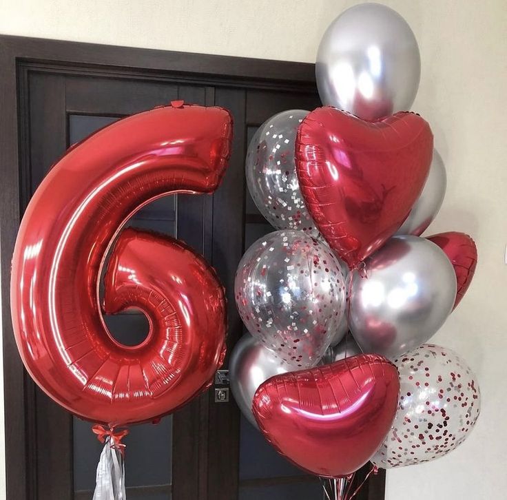 Helium Balloons Single Number Set Red '6' and Latex Clear with Confetti and Silver, Red Heart-Shaped Foil Bunch - Perfect for any Occasions!