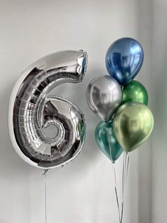 Helium Balloons Single Number Set Silver '6' with Latex Chrome Blue, Green and Silver Bunch with Ribbons - Perfect for any Occasions!