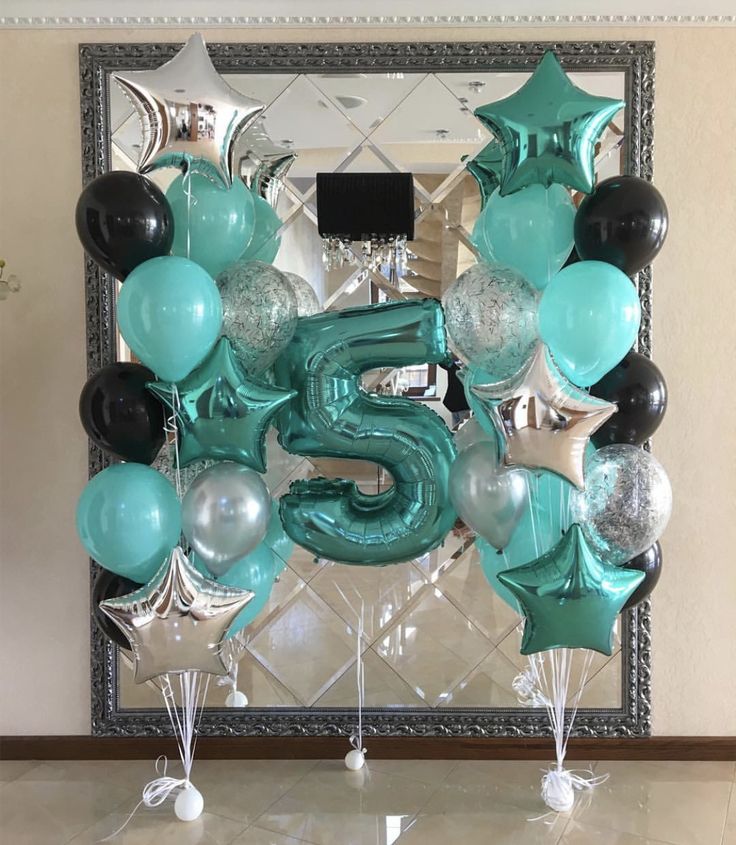 Helium Balloons Single Number Set Teal '5' and Latex Bunch Black, Teal, Silver, Clear with Confetti and Star-Shaped Foil - Perfect for any Occasions!