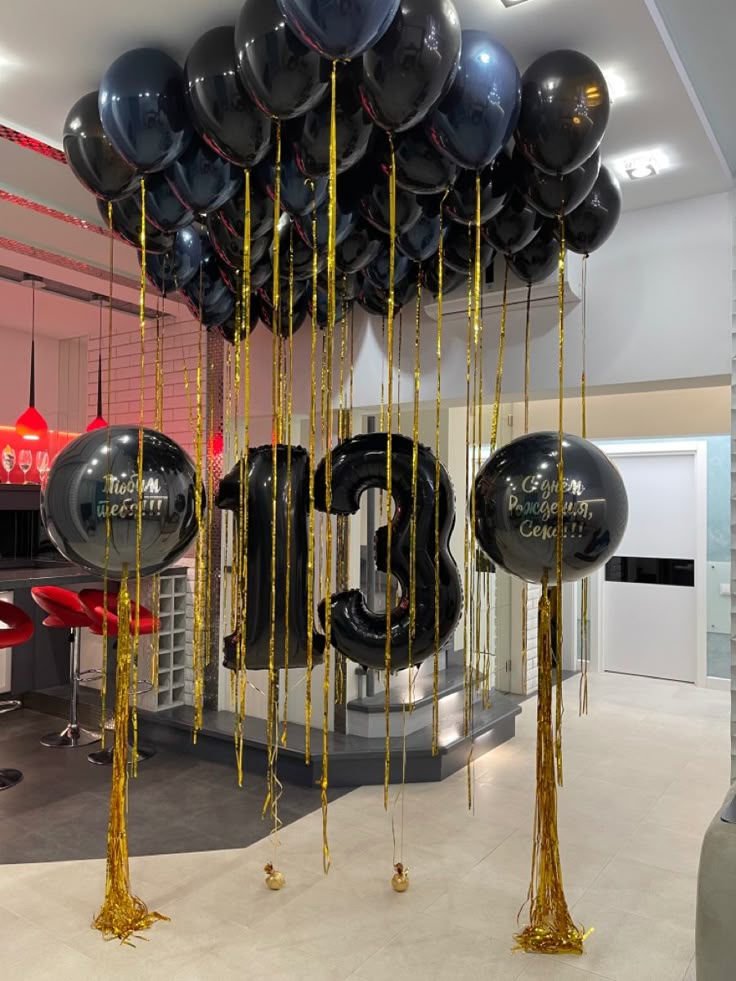 Helium Balloons Two Number Set Black '13', Personalised Clear with Black Latex, Customize Sticker, Latex Ceiling Black and Navy Blue with Gold Tassels - Customizable Decor