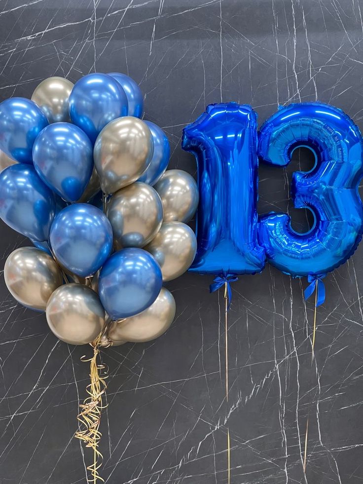 Helium Balloons Two Number Set Blue '13' with Latex Chrome Blue and Light Gold Bunch - Perfect for any Occasions!