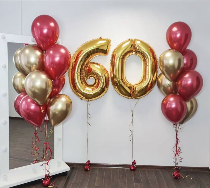 Helium Balloons Two Number Set Gold '60' with Latex Chrome Red and Light Gold Bunch - Perfect for any Occasions!
