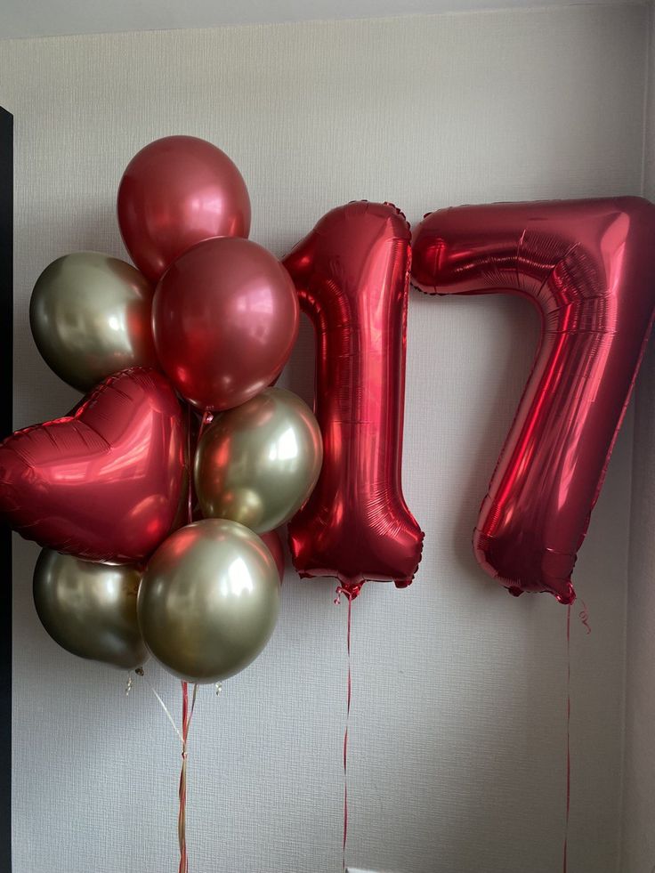 Helium Balloons Two Number Set Red '17' with Latex Chrome Red and Light Gold with Heart-Shape Bunch - Perfect for any Occasions!