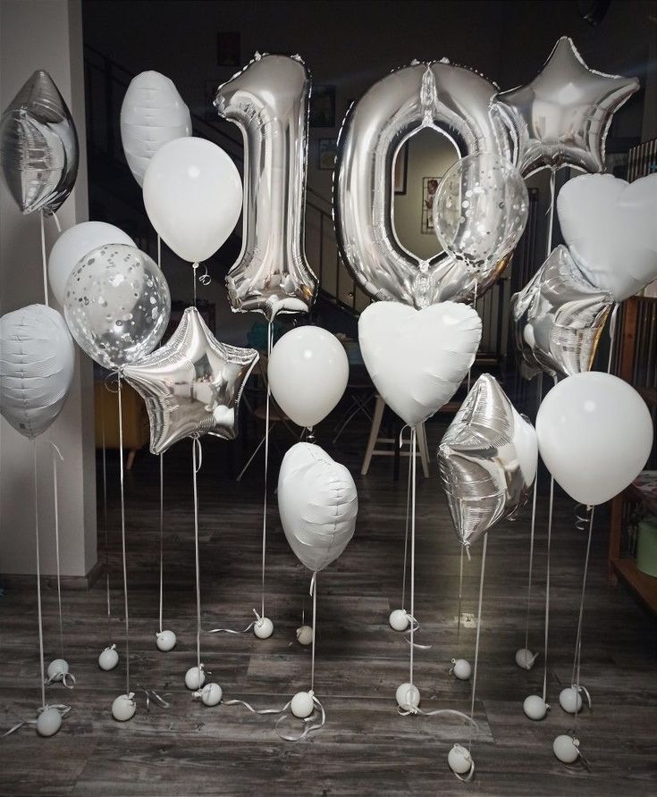 Helium Balloons Two Number Set Silver '10' and Latex White, Clear with Confetti, Star Silver and White Heart Foil - Perfect for any Occasions!
