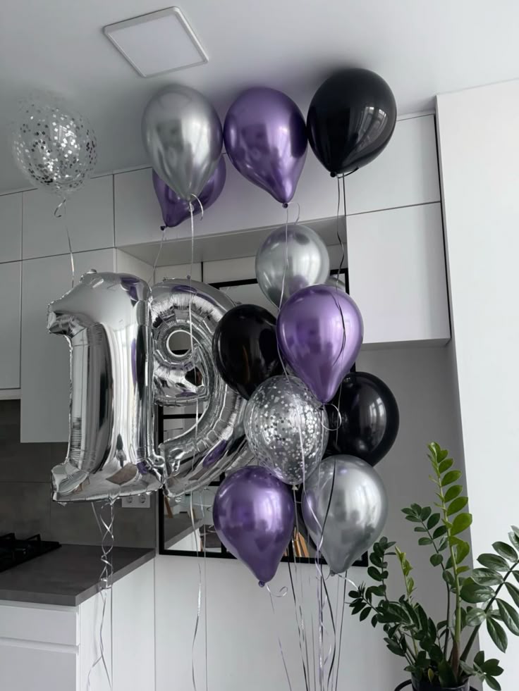 Helium Balloons Two Number Set Silver '19' and Latex Bunch Chrome Purple, Silver, Black and Clear with Confetti - Perfect for any Occasions!