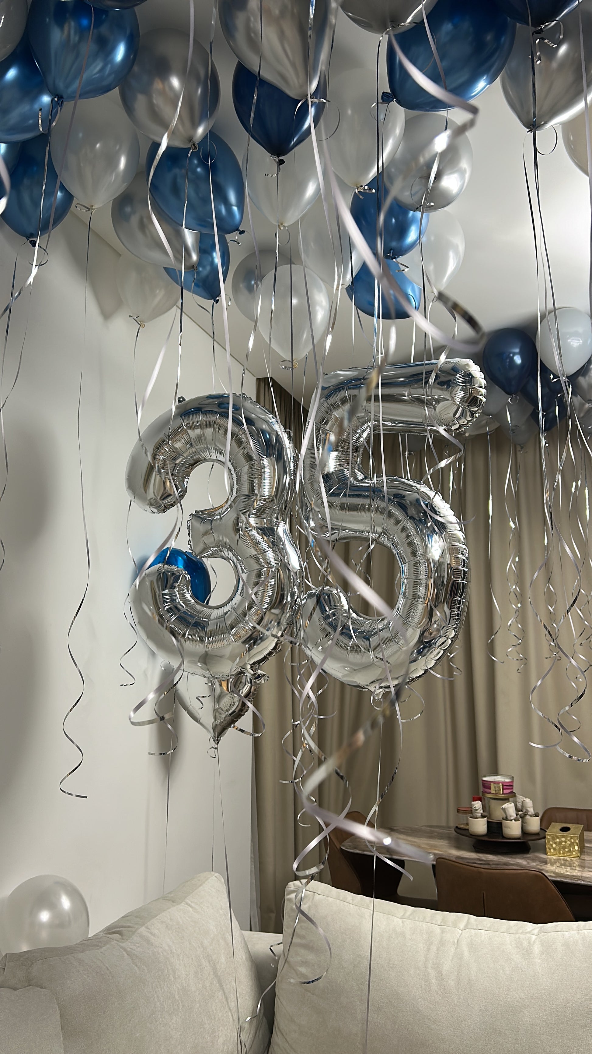 Helium Balloons Two Number Set Silver '35' with Ceiling Latex Pearl White, Chrome Blue, Navy Blue and Silver - Perfect for any Occasions!