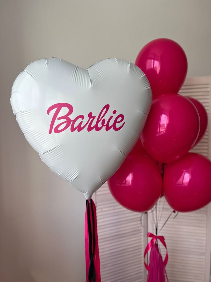 Helium Balloons White 35-inches Heart-Shaped with Sticker and Dark Pink Latex Bunch with Ribbons and Tassels - Barbie-Themed Perfect for any Occasions