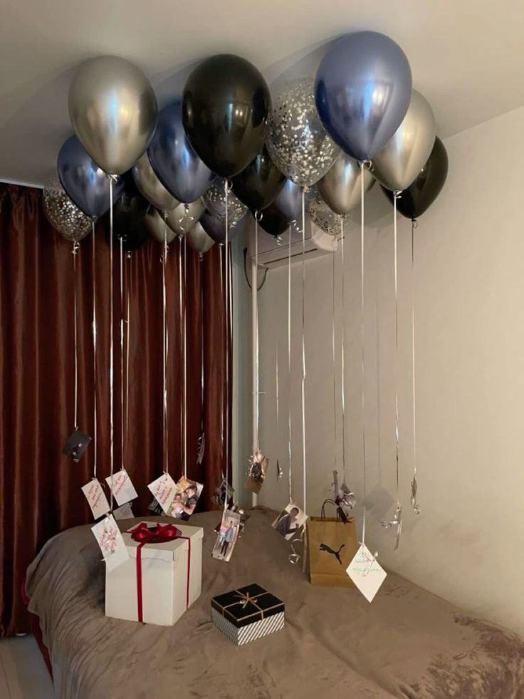 Helium Ceiling Latex Clear with Confetti, Silver, Black and Chrome Blue Balloons with Personalize Photos - Customizable Design