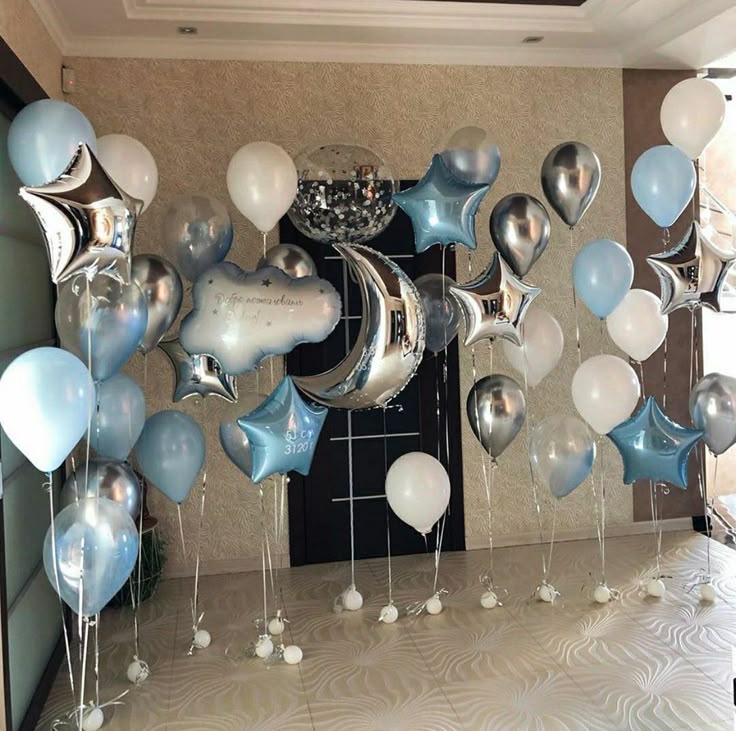 Helium Blue, White and Silver Latex with Cloud, Stars and Moon Bunches Balloon Decor - Perfect for Welcoming Baby!