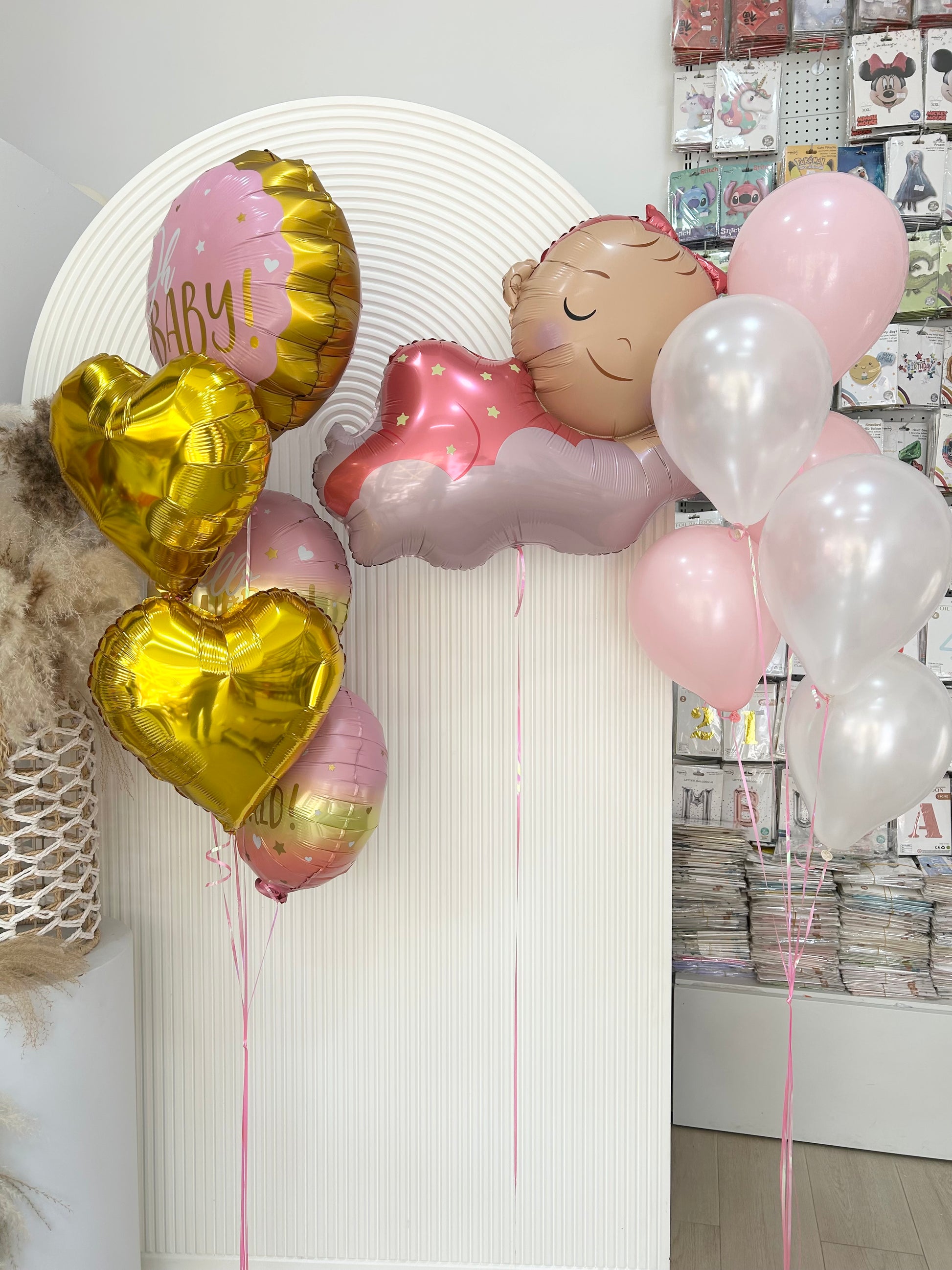 Helium Set Sleeping Baby Girl with ‘Oh Baby’ Gold Hearts Foil, Latex Pearl White Pink – Customizable Design Baby Shower Welcome Baby Girl