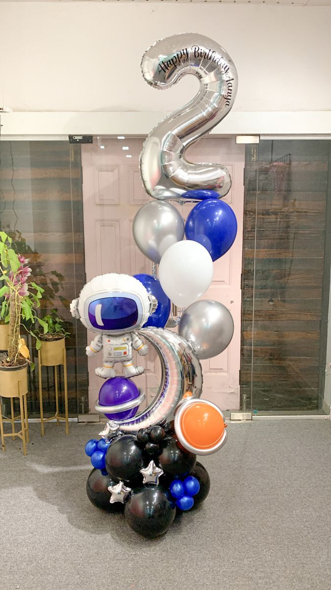 Helium Silver Number '2' with Latex White Blue Silver Bunch and Silver Moon with Astronaut and Stars accent on Stand – Customizable Design Galaxy-Themed