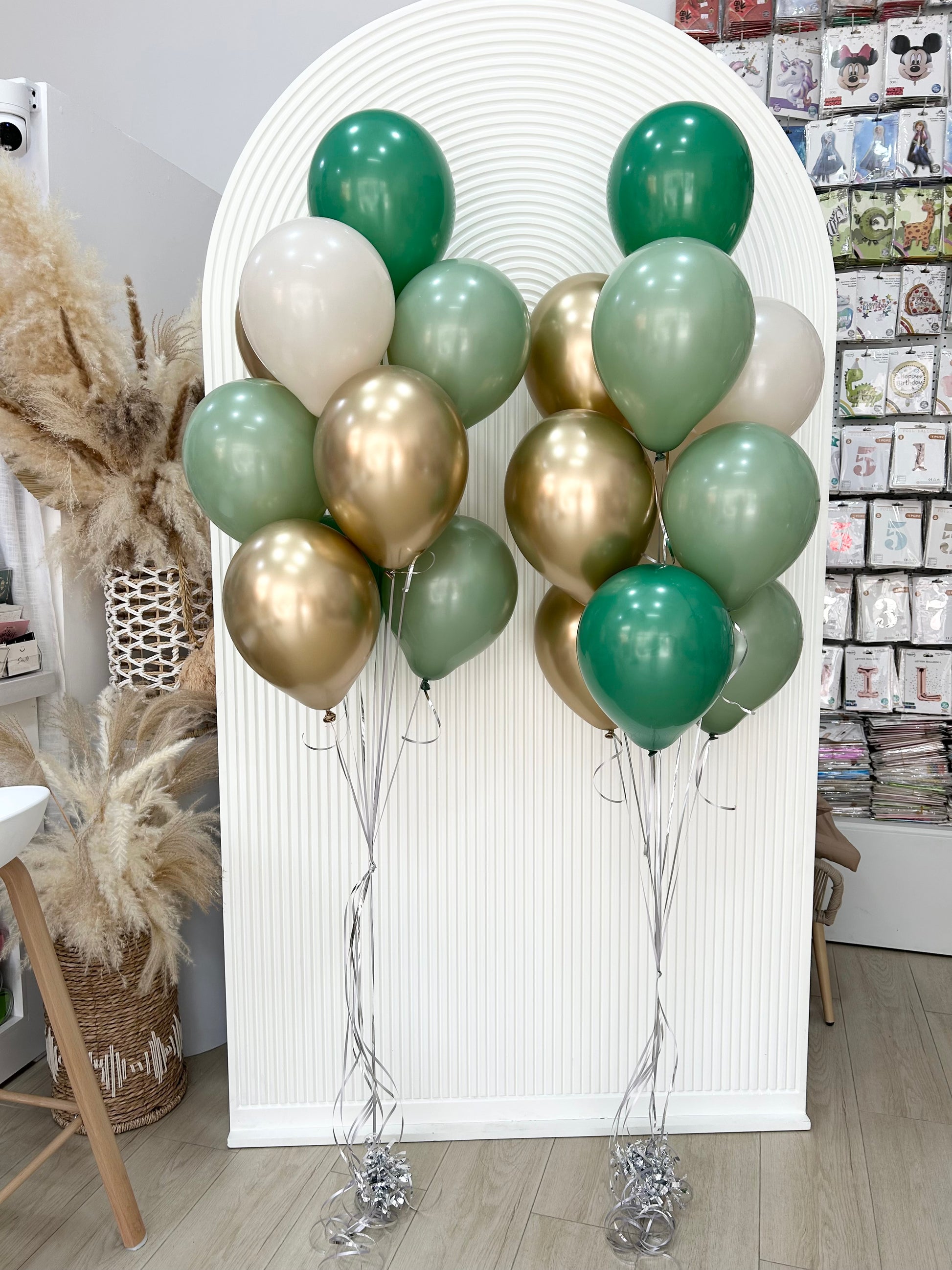Latex Helium Balloon Dust White, Dark Green, Olive Green and Light Gold Bunch with Strings - Perfect for any special occasions!