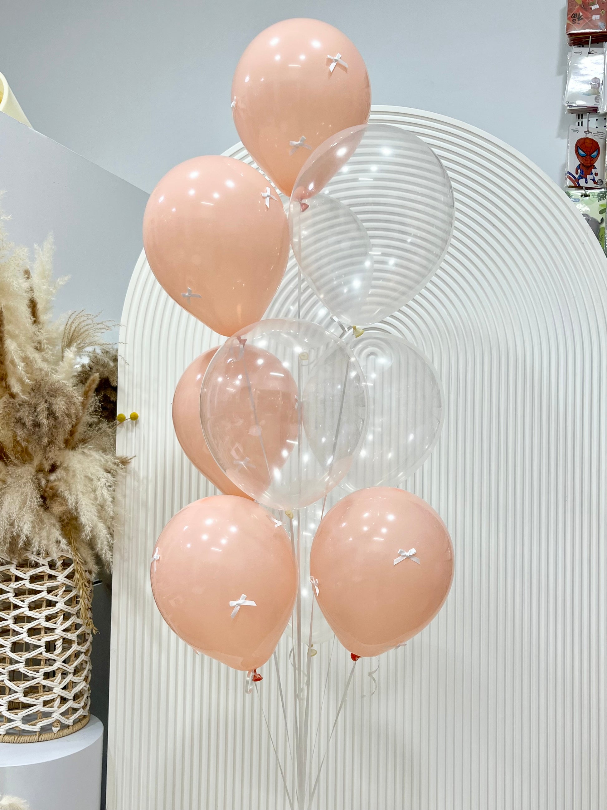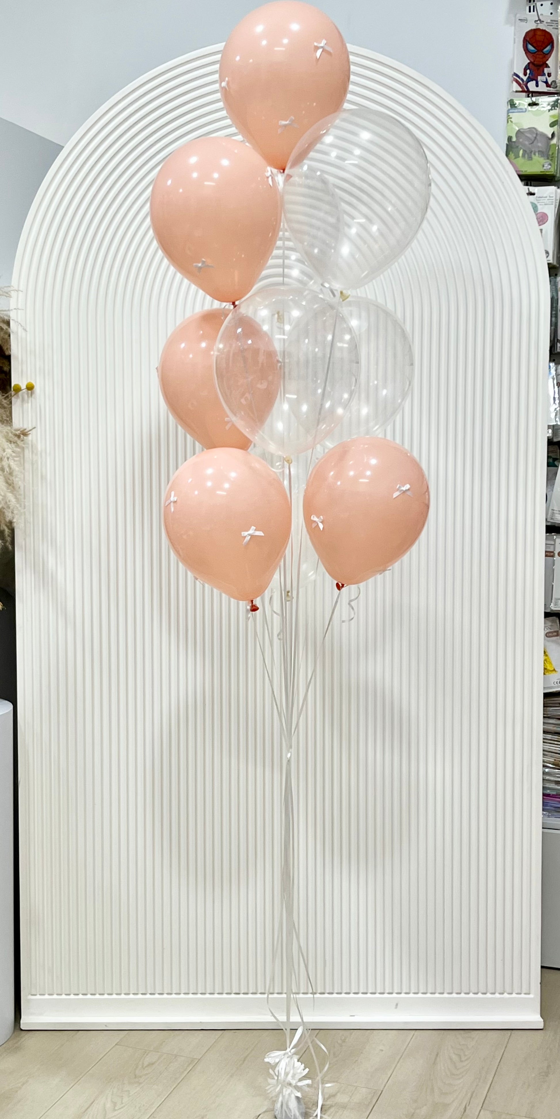 Latex Helium Bunch Peach and Clear with White Ribbons - Customizable Design