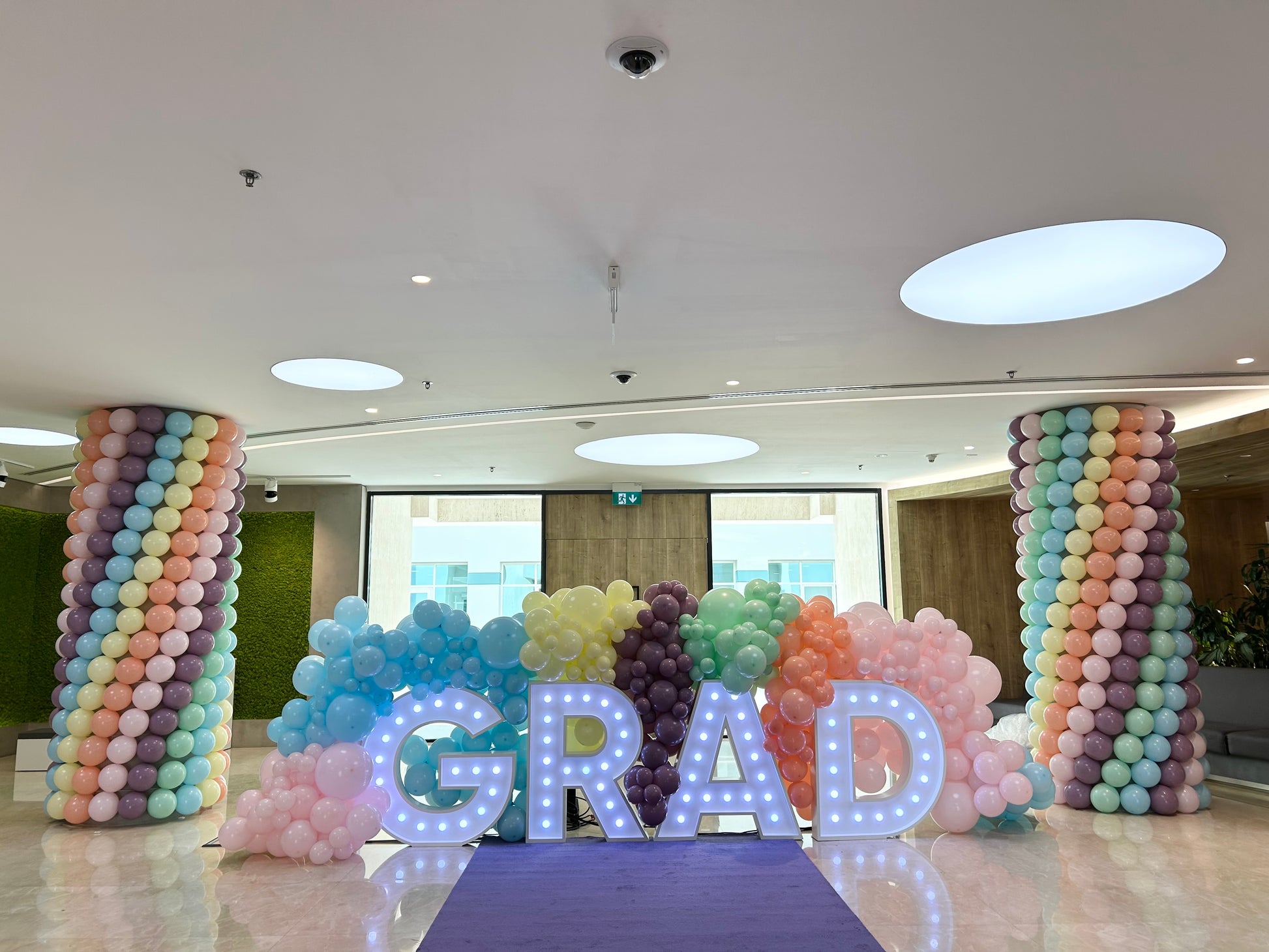 LED Letters Marquee “GRAD” with Organic Balloons Mint Green, Peach, Pink, Blue and Purple Arrangement and Pillar Post - Perfect for Graduation