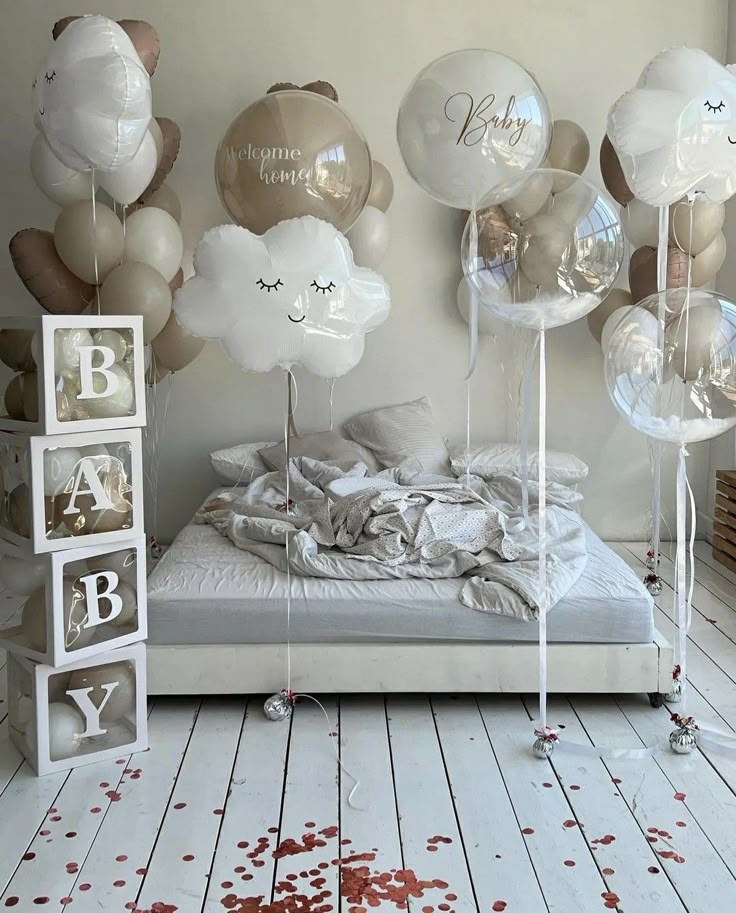 Personalised Clear with Feather and Sticker, Latex Beige and White with Beige and Brown Hearts Balloons Bunch, White Clouds Foil Helium and "BABY" Box with Mini Balloons and Petals - Baby Shower, Perfect for special occasions!