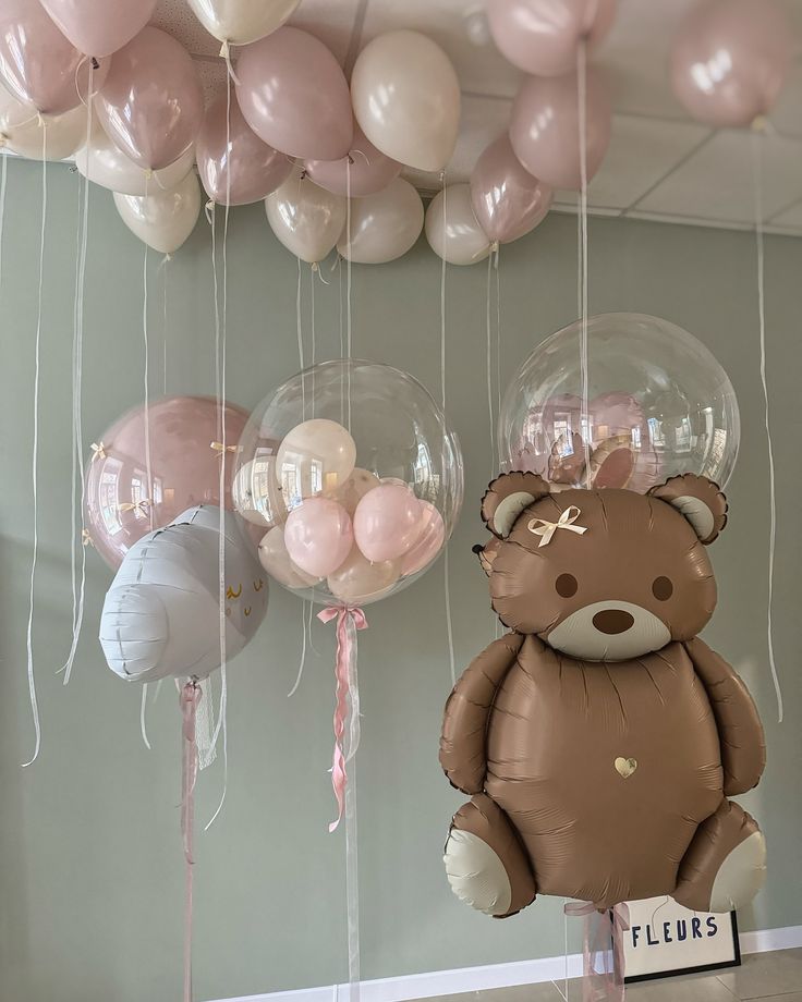 Personalised Clear with Mini Latex, Clear with Pink Latex, Brown Bear, White Cloud and Helium Latex Pink and Beige Ceiling and Bunch - Baby Shower, Bear-Themed Perfect for any Occasions