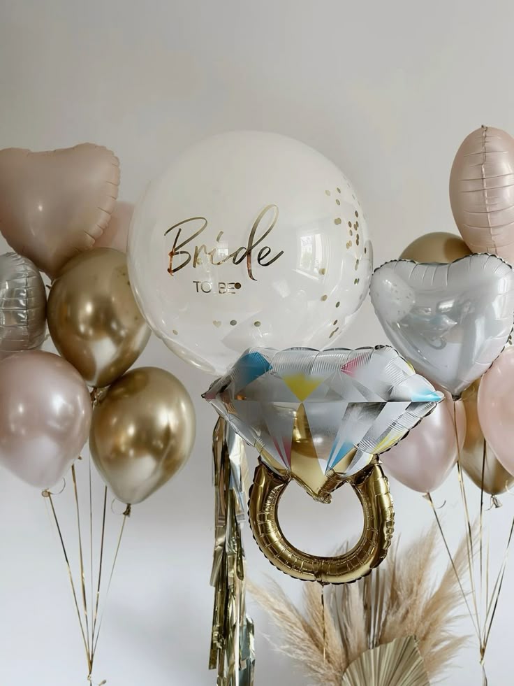 Personalised Clear with White Latex and Customize Sticker, Engagement Gold Diamond Ring and Helium Bunch Pink and Silver Heart-Shaped and Latex - Bridal Shower Perfect for Special Occasions!