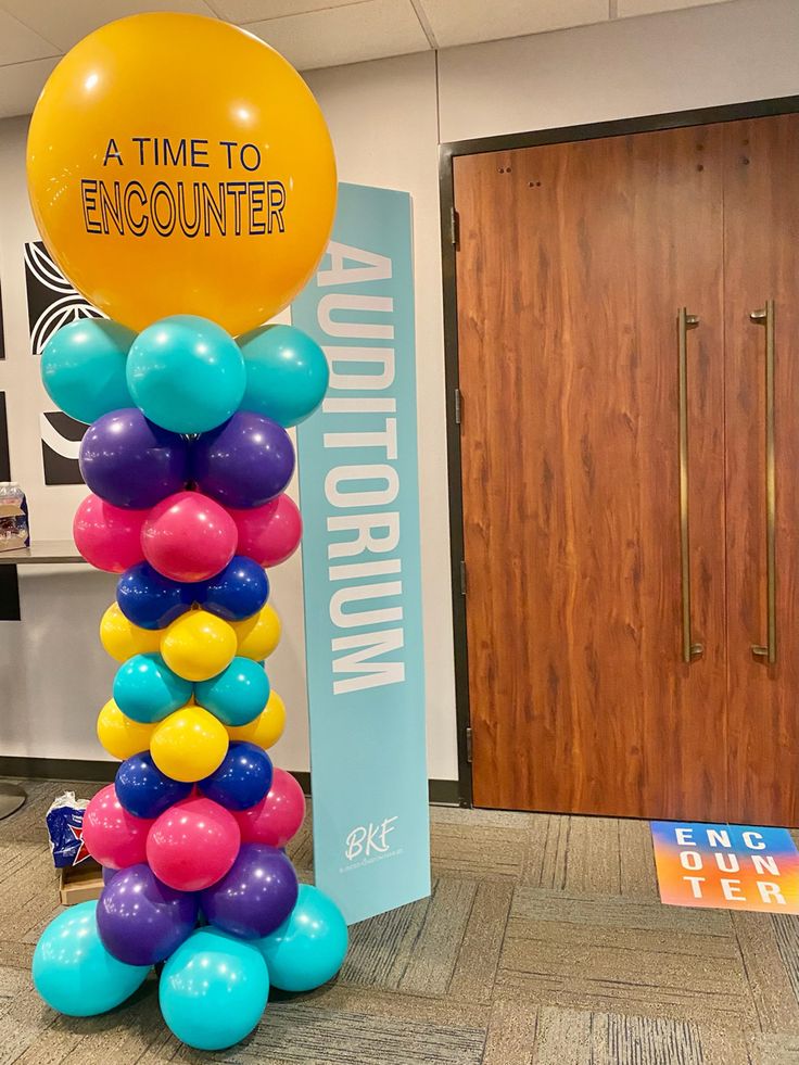 Personalised Company Logo Sticker Balloon Teal, Purple, Deep Pink and Yellow Pillar/Column/Tower - Corporate Event, Grand Opening, Company Event Perfect for special occasion!