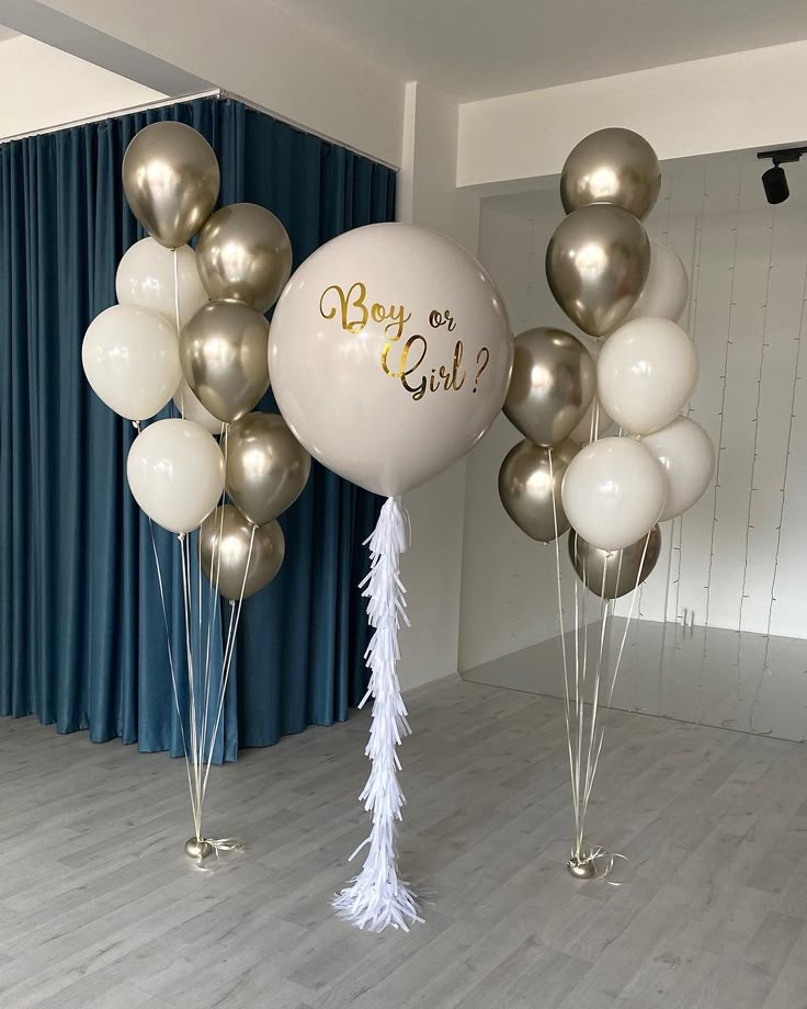 Personalised Gender Reveal Helium Balloon Beige Latex with Customize Sticker, White Tassels and Helium Bunch of Beige and Light Gold - Customizable Design