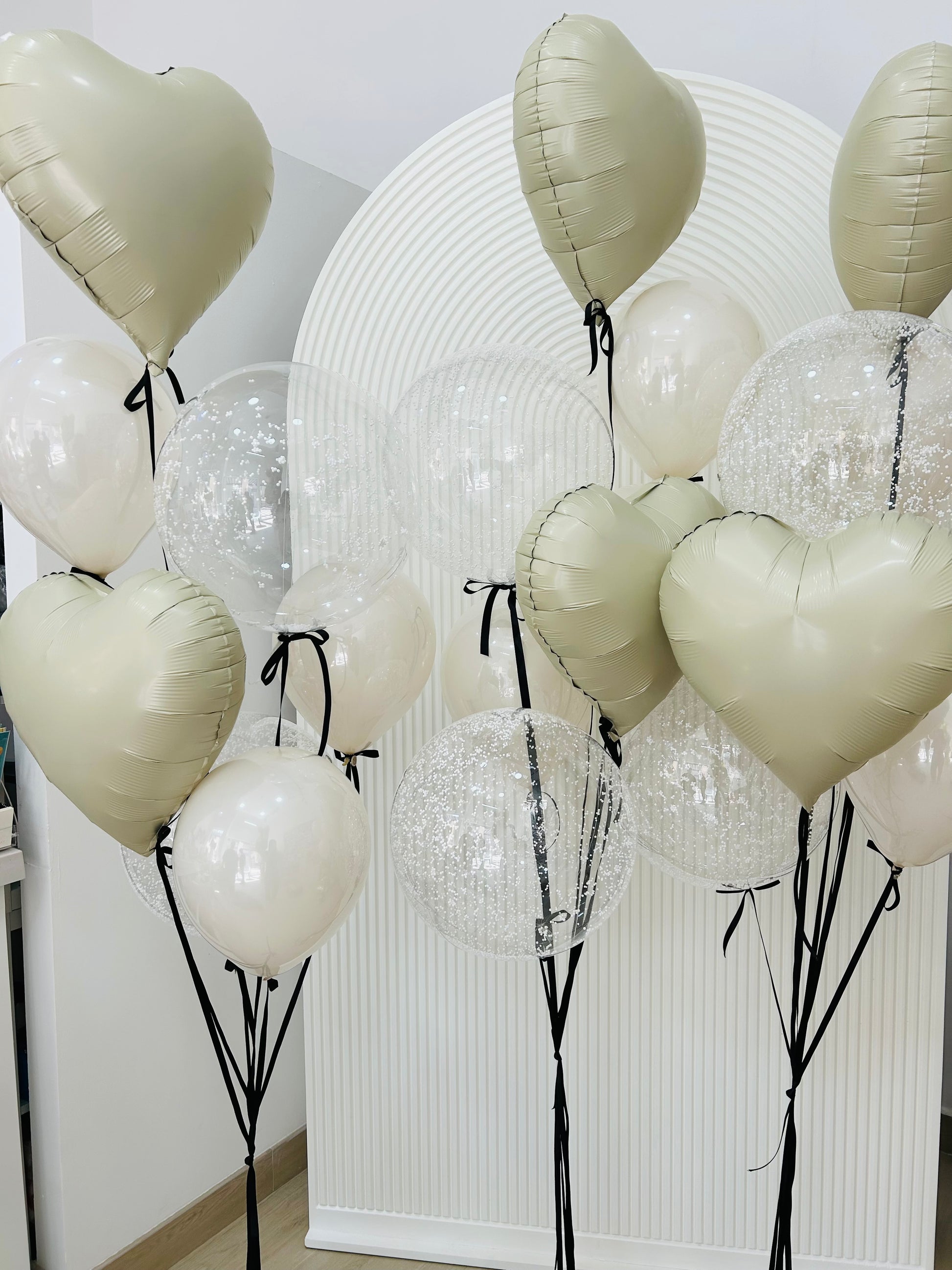 Personalised Helium Balloon Clear with White Foam, Double Layered White Latex and Beige Heart-Shaped Foil Bunch with Black Ribbons - Perfect for any Occasions