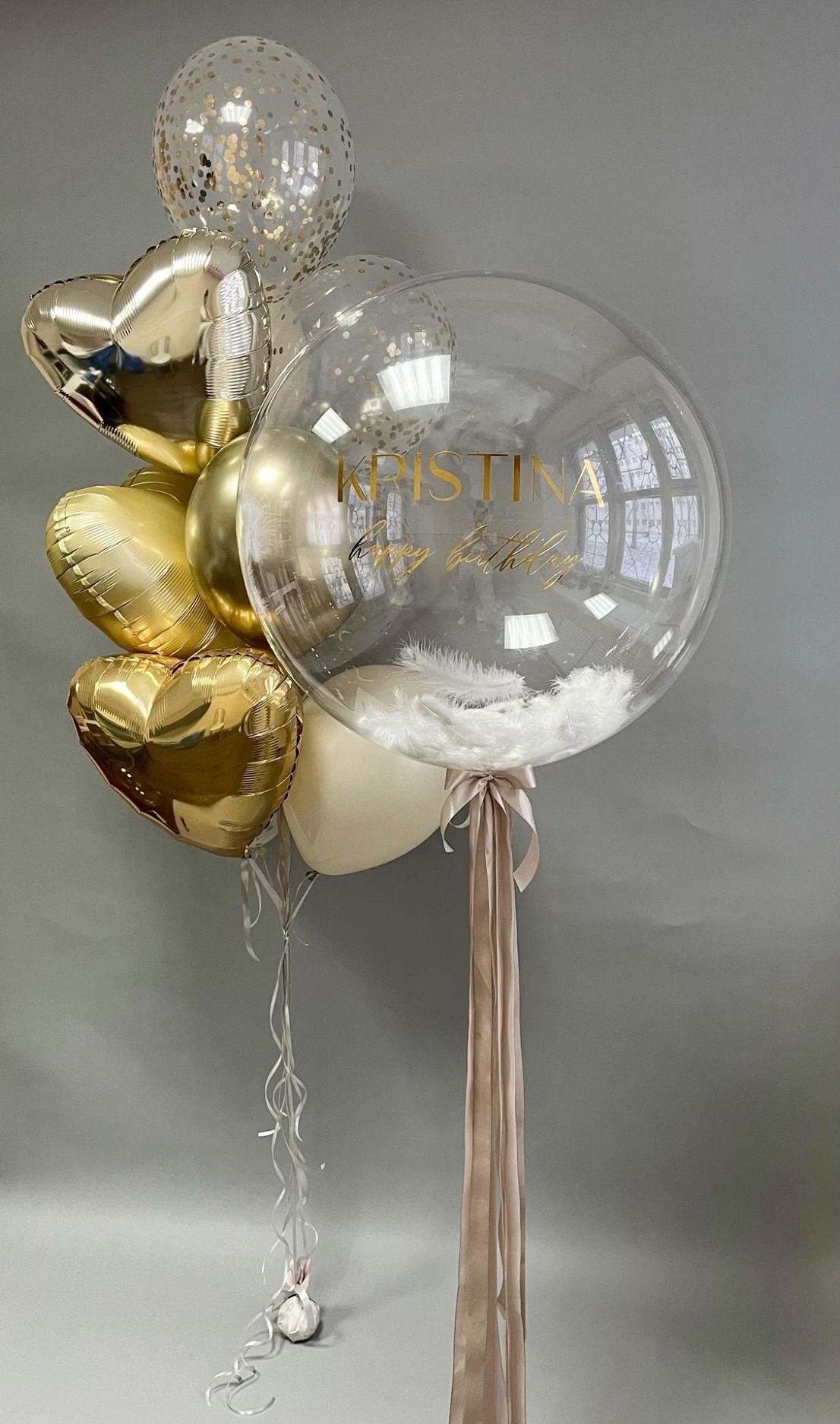 Personalised Helium Balloon Clear with Dust White&Light Gold Latex, Heart-Shaped Helium, Customizable Sticker and Tassels - Perfect for any Occasions