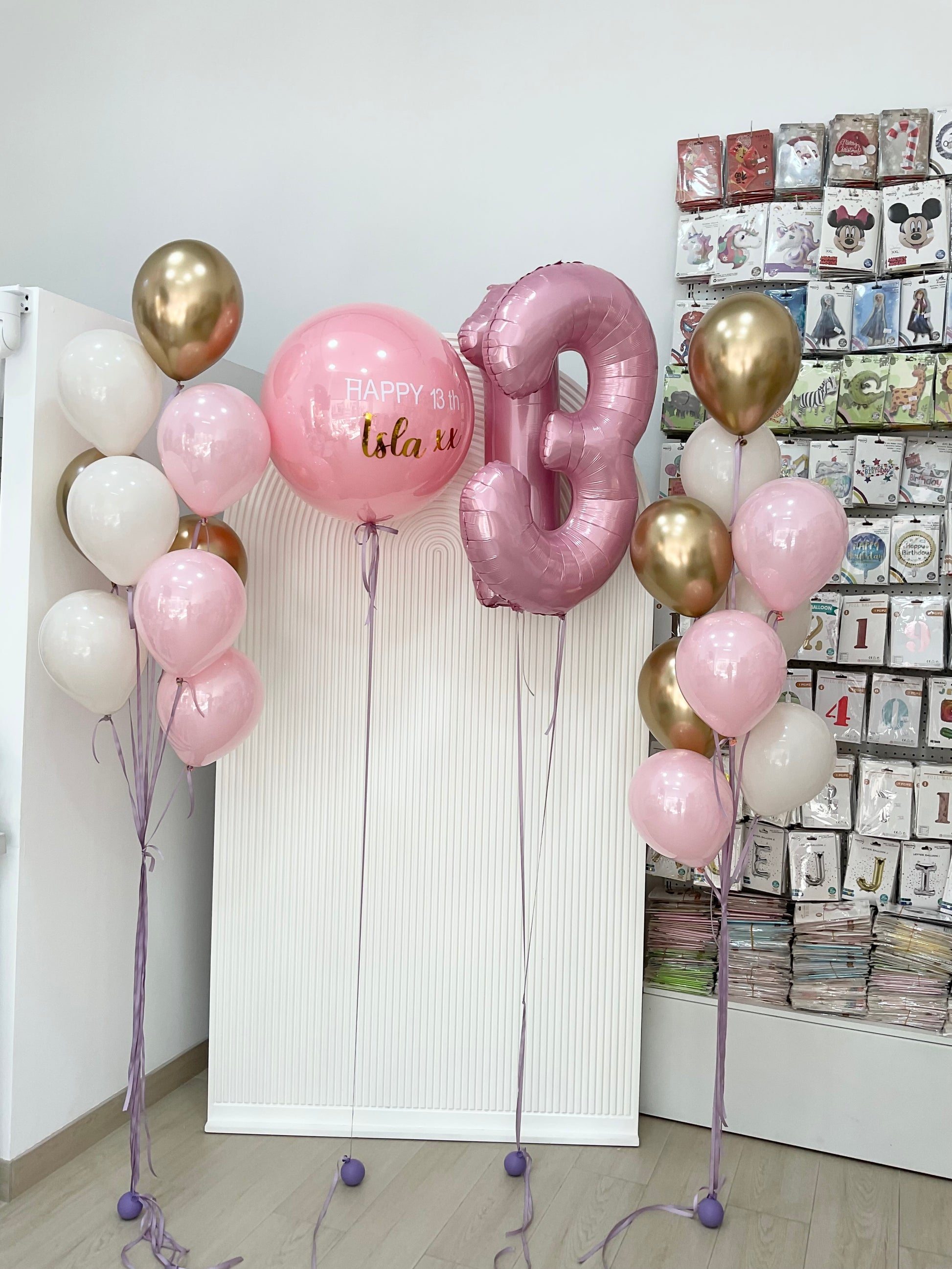 Personalised Helium Clear with Balloon Light Gold, Pink and White Latex Bunch, Pink ‘13’ Number Balloon with Customizable Stickers and Purple Ribbons - Perfect for any Occasions