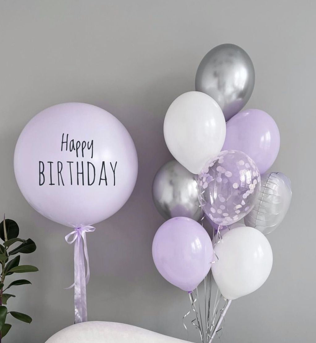Personalised Helium Balloon Clear with Purple&Silver&White Latex, Heart-Shaped Heliums, Customizable Sticker and Ribbons - Perfect for any Occasions