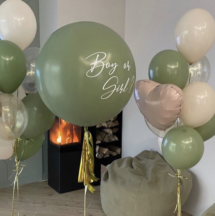 Personalised Gender Reveal Helium Balloon Green Latex with Customize Sticker and Helium Bunch of Olive Green, Beige, Clear and Heart-Shaped - Customizable Design