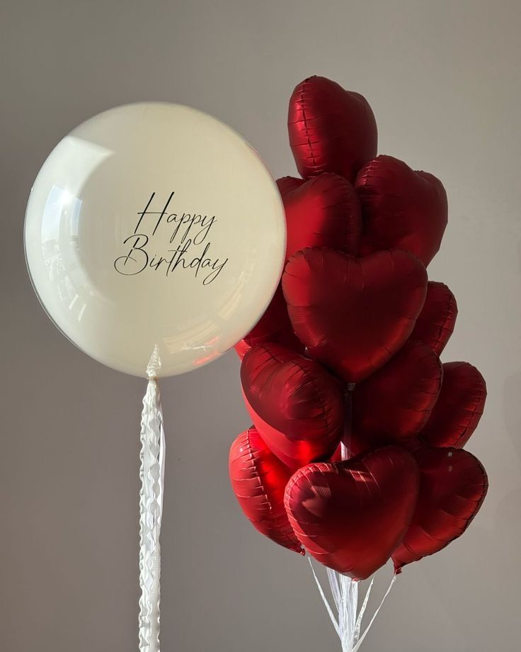 Personalised Helium Balloons Clear with White Latex, Ribbons and Customize Sticker and Red Heart-Shaped Foil Helium Bunch - Perfect for any Occasions