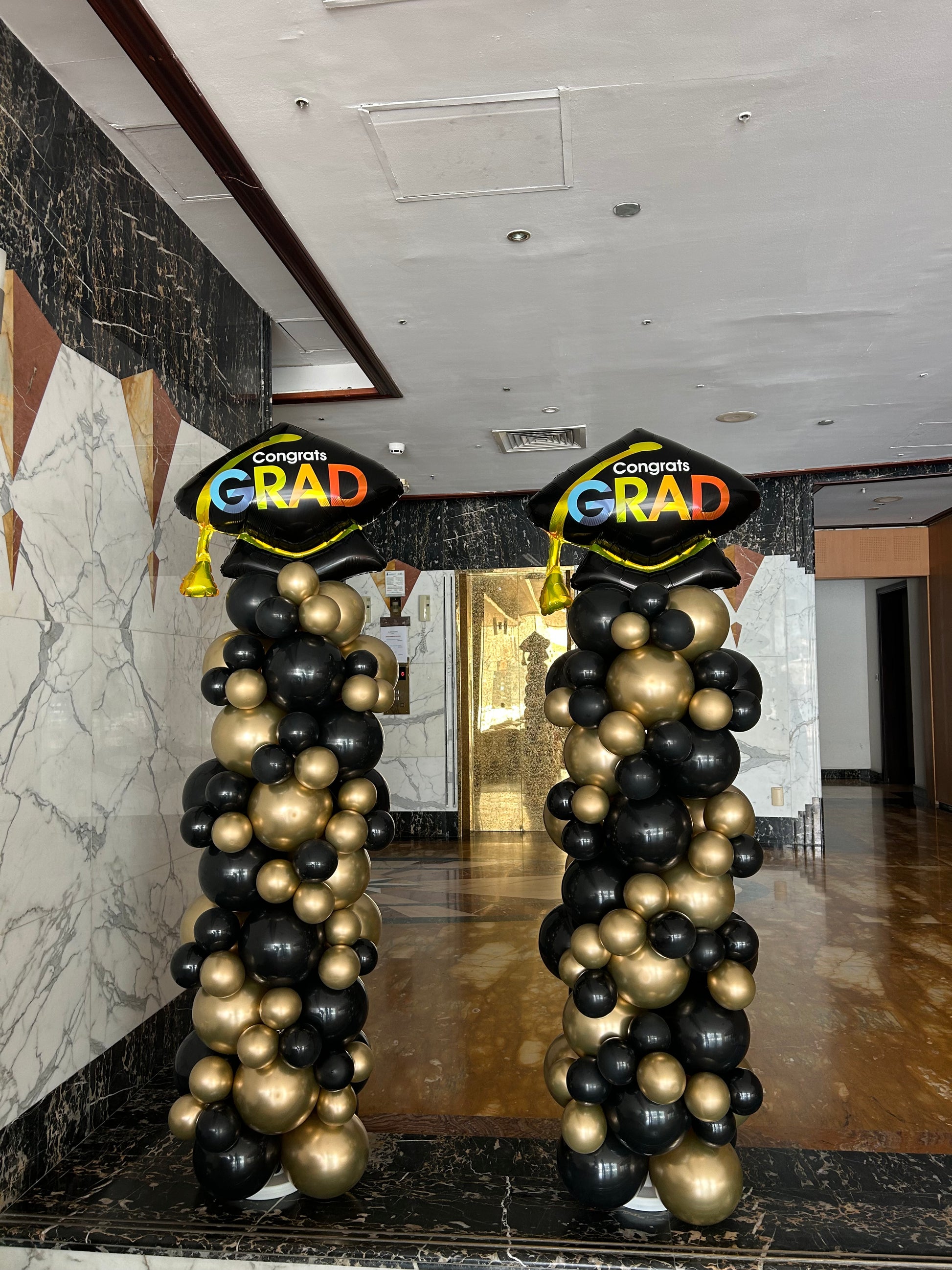 Personalised Light Gold and Blac Pillar/Column/Tower with Graduation Hat Foil Balloons – Perfect for Graduation