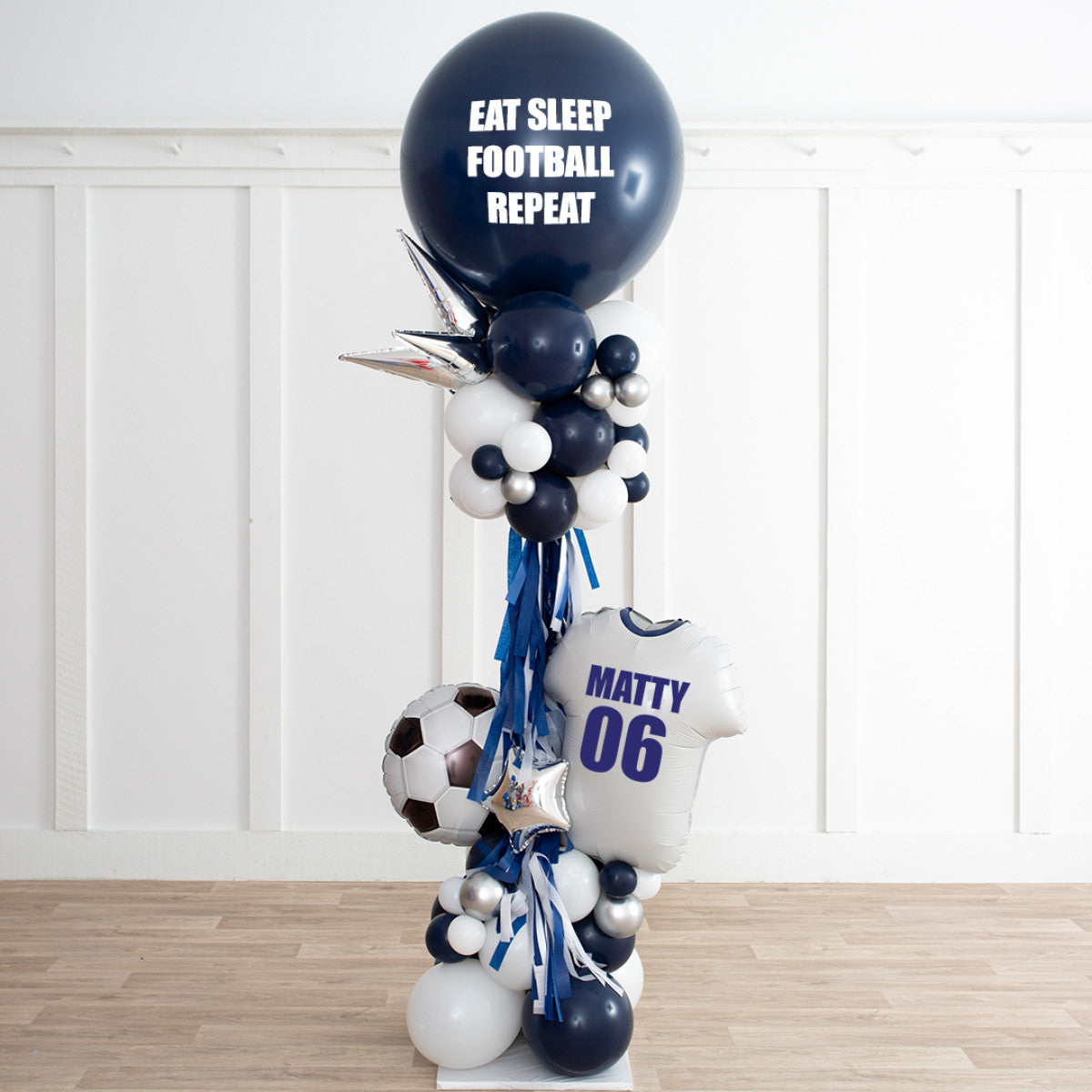 Personalised Navy and White Football Balloon and Tassels Pillar/Column/Tower - Customizable for Any Sports-Themed Celebrations