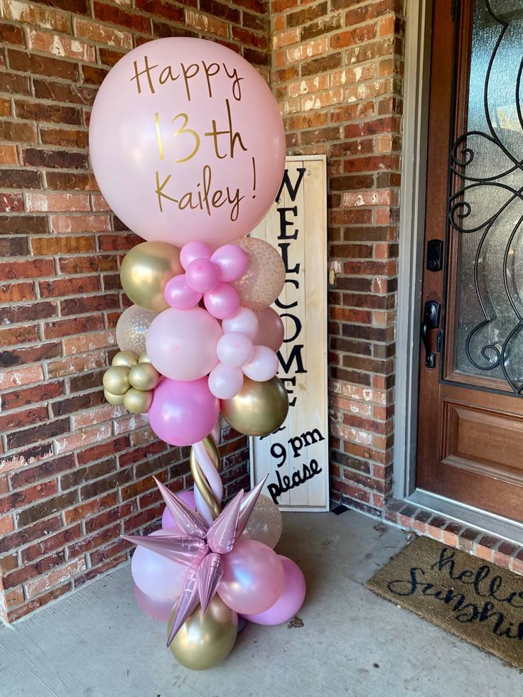 Personalised Pillar/Column/Tower Balloons White, Pink and Light Gold with Customize Sticker and Tassels with Starburst accents - Birthday, Corporate Event, Grand Opening, Company Event Perfect for special occasion!