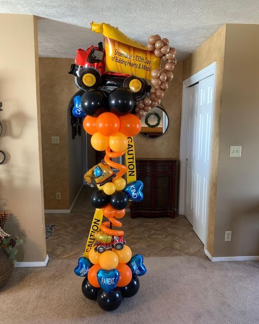 Personalised Pillar/Column/Tower Truck-Themed with Orange, Yellow and Brown Latex, Mini Truck and Caution Sign – Perfect for Any Celebrations