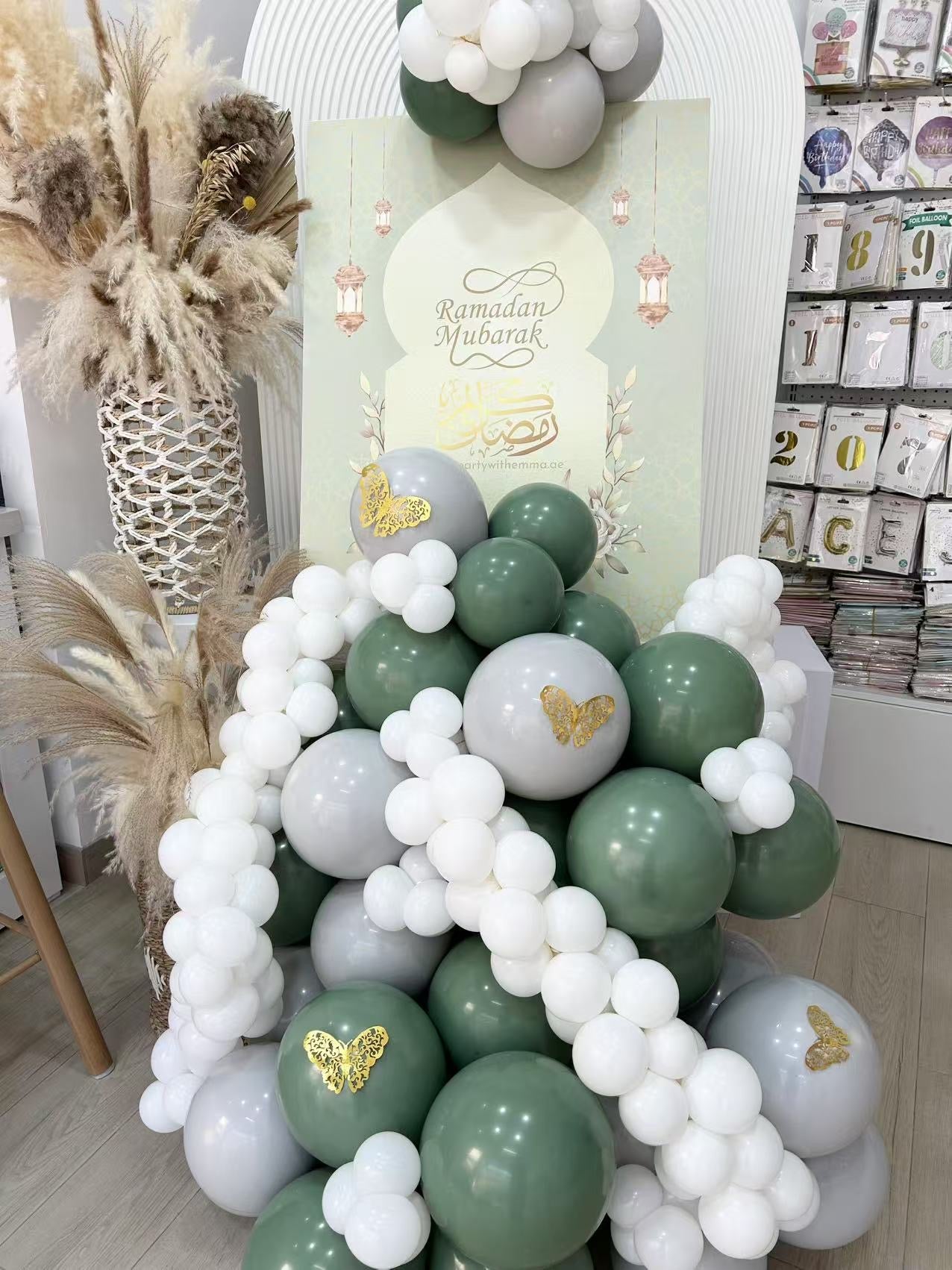 Personalised Ramadan Balloon Dust White, Olive Green and White Mini Chain with Gold Butterfly Accents and Printed KT Board – Ramadan Celebration Decor