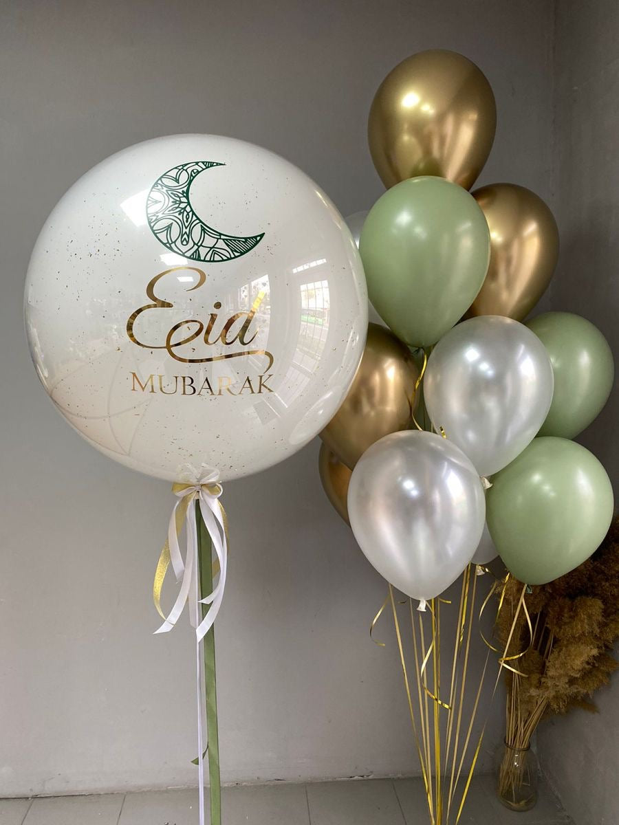 Personalised Helium Clear with White Latex, Stickers and Green Gold and White Latex in Bunch Ramadan Balloon Set – Ramadan Celebration Decor