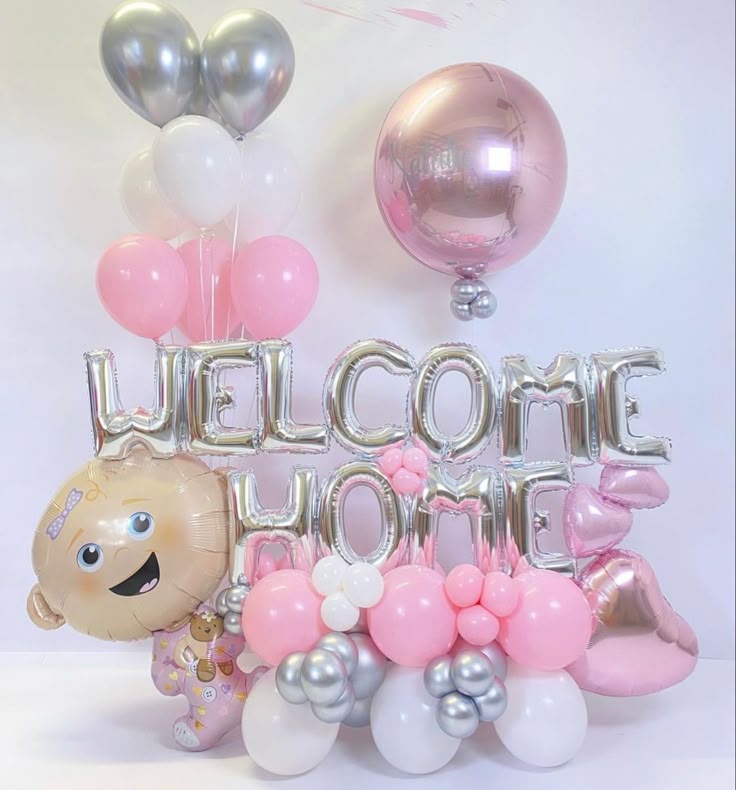 Platform Baby Shower Celebration Balloons Pink Silver White Balloon with Baby Foil, Letters "WELCOME HOME", Heart and Orbs and Latex Helium Balloons – Customizable Design