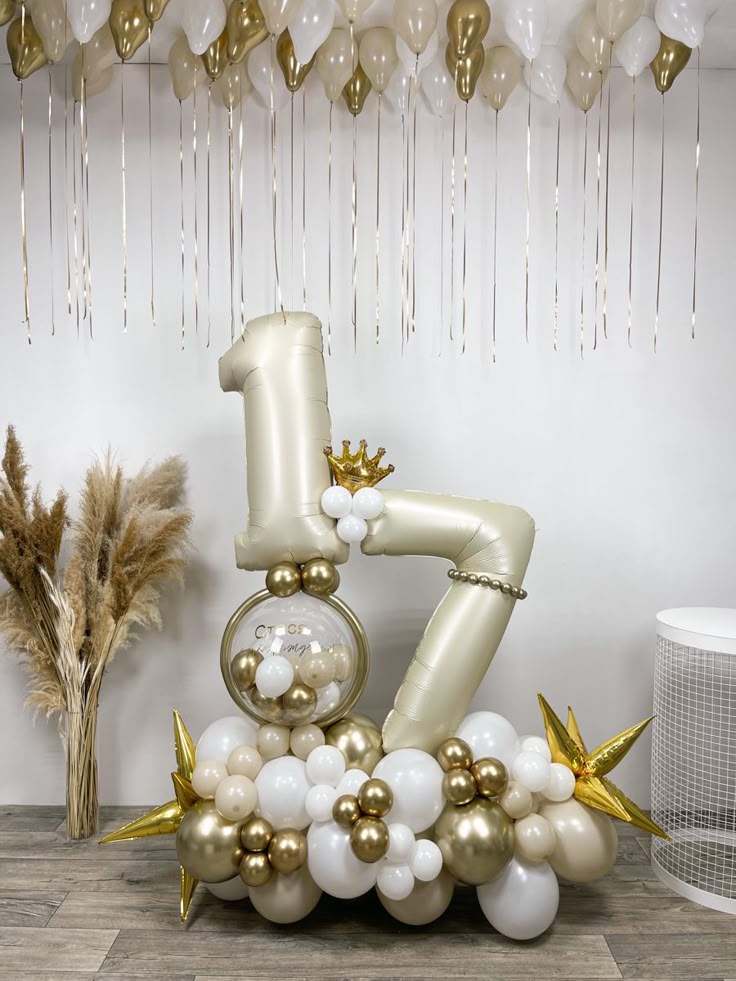 Platform Beige Numbers '17' with Latex Beige, White, Light Gold and Clear with Customize Sticker, Mini Crown and Starburst accents and Ceiling Helium Latex – Customizable Design