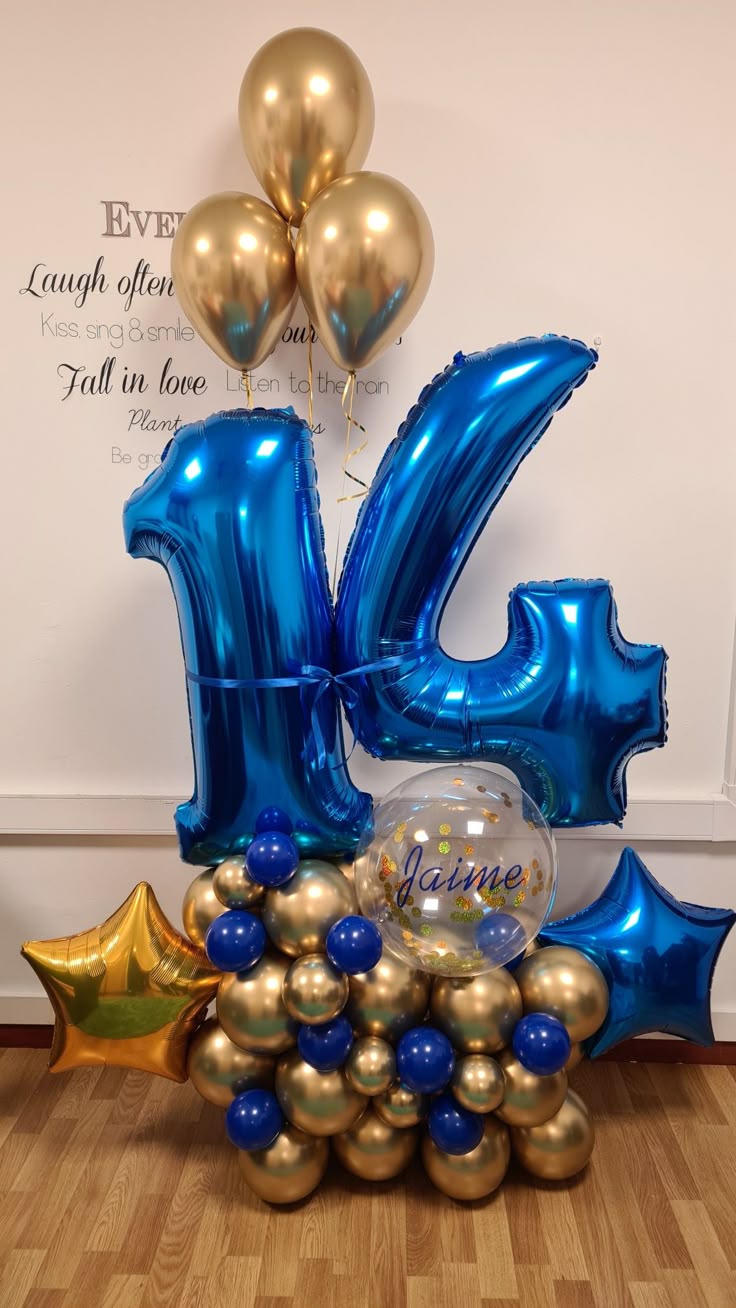 Platform Blue Numbers '14' with Latex Clear with Customize Sticker, Blue and Gold with Star Foil accents and Helium Latex Bunch – Customizable Design