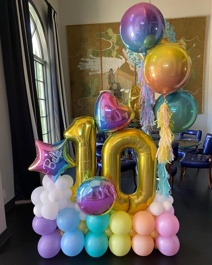 Platform Gold Numbers '10' with Latex Blue, Purple, Pink, Yellow, Peach and White with Heart Star accents and Orbs Helium Bunch with Tassels – Customizable Design