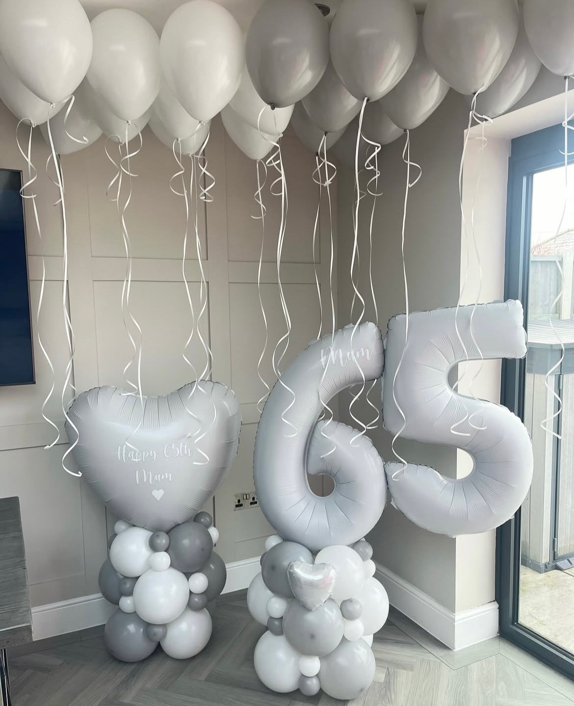Platform Gray Number '65', Heart-Shaped Balloon on Stand with Customize Sticker, Latex White and Gray Helium Ceiling Balloons – Customizable Design