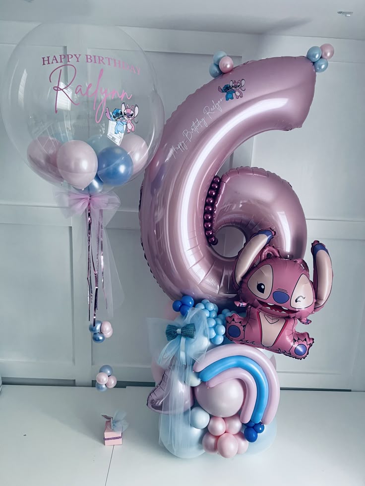 Balloon on Stand Purple Numbers '6' with Latex White, Purple and Stitch accents, Personalised Clear with Sticker, Mini Latex and Ribbons Helium Bunch – Stitch-Themed Customizable Design