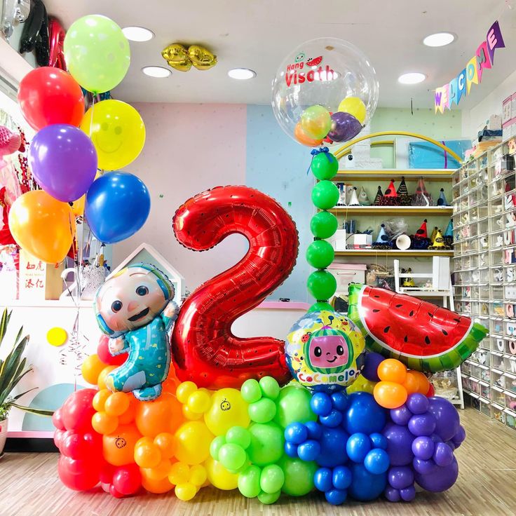 Platform Red Number '2' with Latex Blue, Green, Orange, Yellow, Purple, Red with Cocomelon and Designed Rainbow Balloons accents and Personalised Clear with Mini Latex with Customized Sticker and Helium Latex Bunch – Cocomelon-Themed Customizable Design