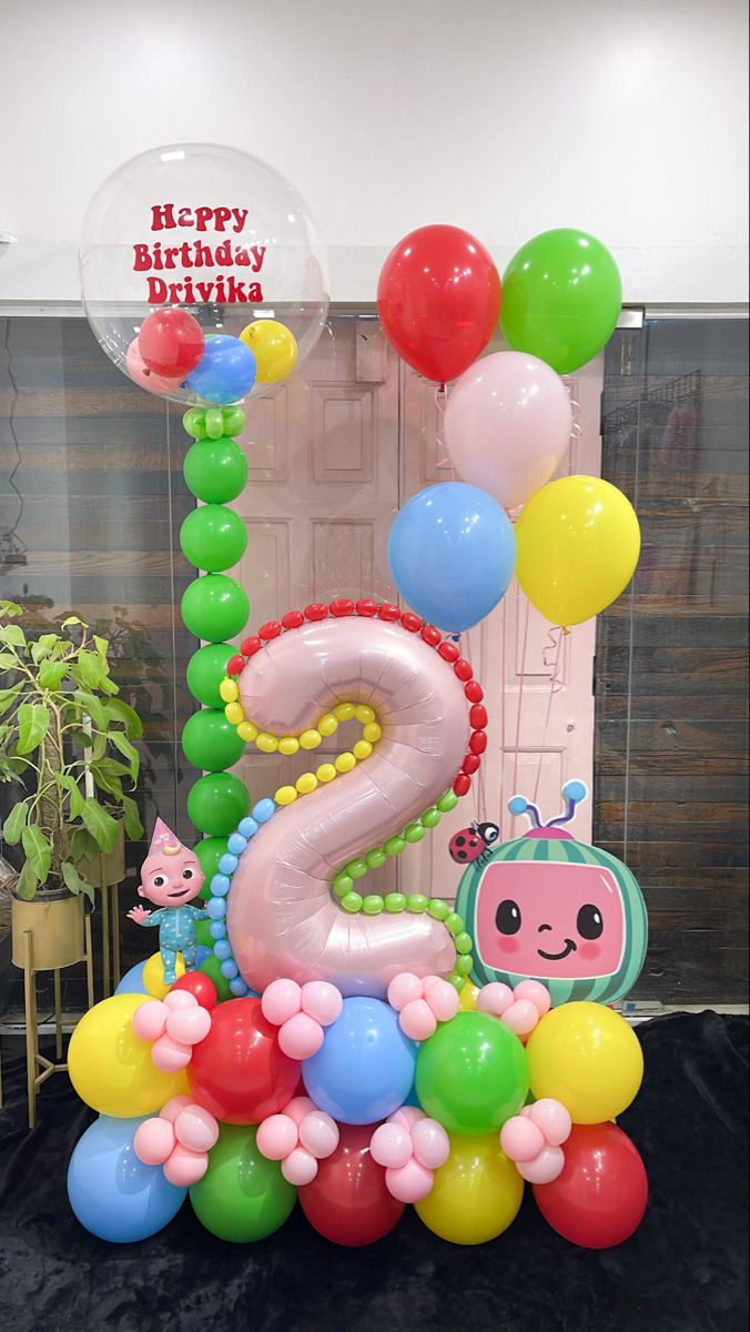 Platform Red Number '2' with Latex Blue, Green, Orange, Yellow, Purple, Red with Cocomelon and Designed Rainbow Balloons accents and Personalised Clear with Mini Latex with Customized Sticker and Helium Latex Bunch – Cocomelon-Themed Customizable Design