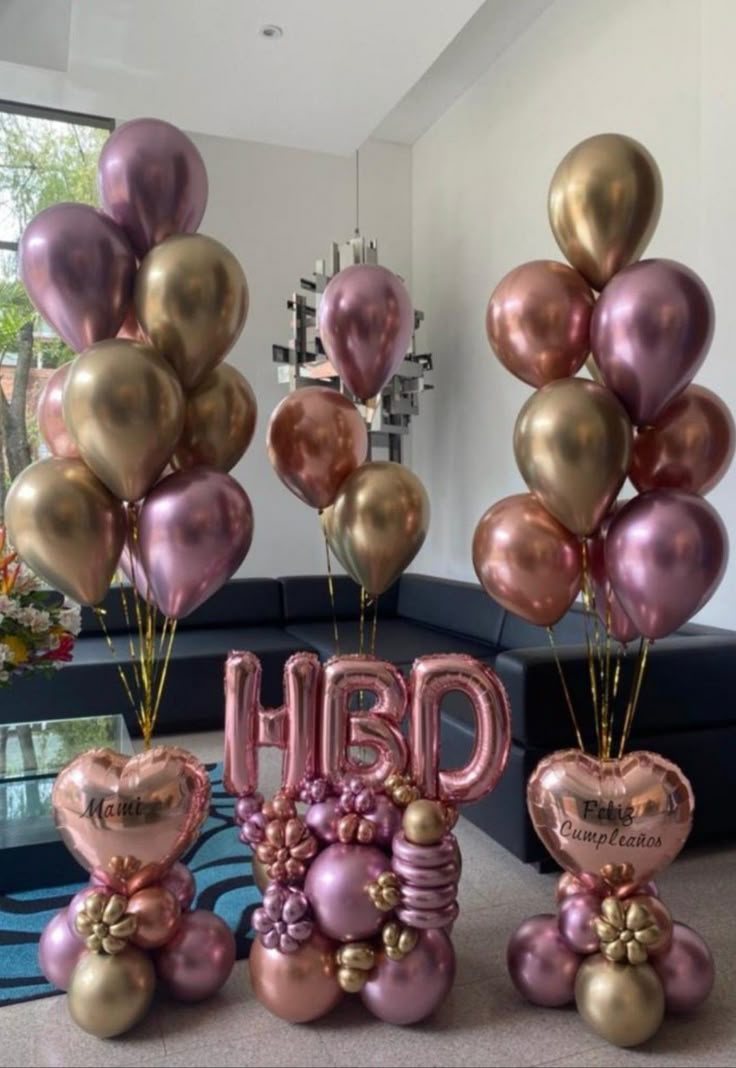 Platform Rose Gold 'HBD' with Heart-Shaped Balloon on Stand with Customize Sticker and Latex Helium Bunch Light Gold, Chrome Pink and Purple – Customizable Design